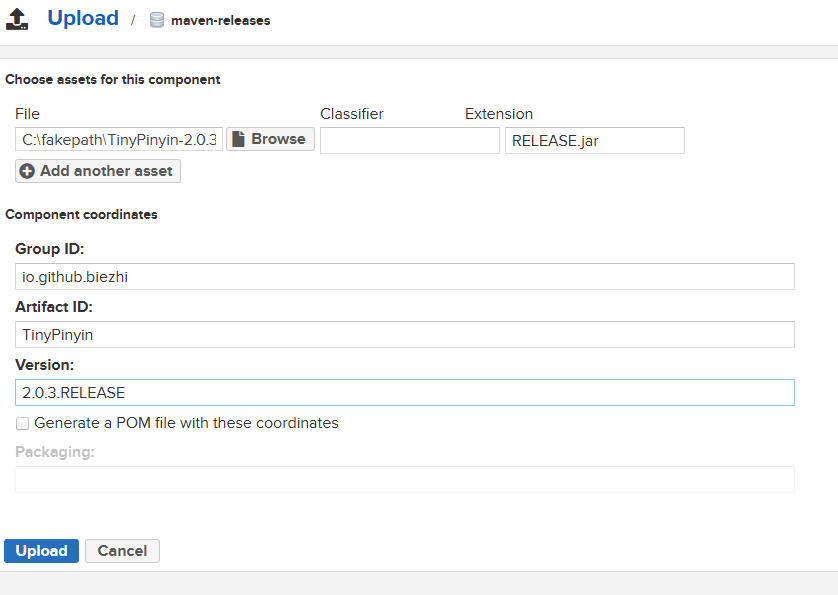 Browse...上传你的文件TinyPinyin-2.0.3.RELEASE.jar填写坐标如下: